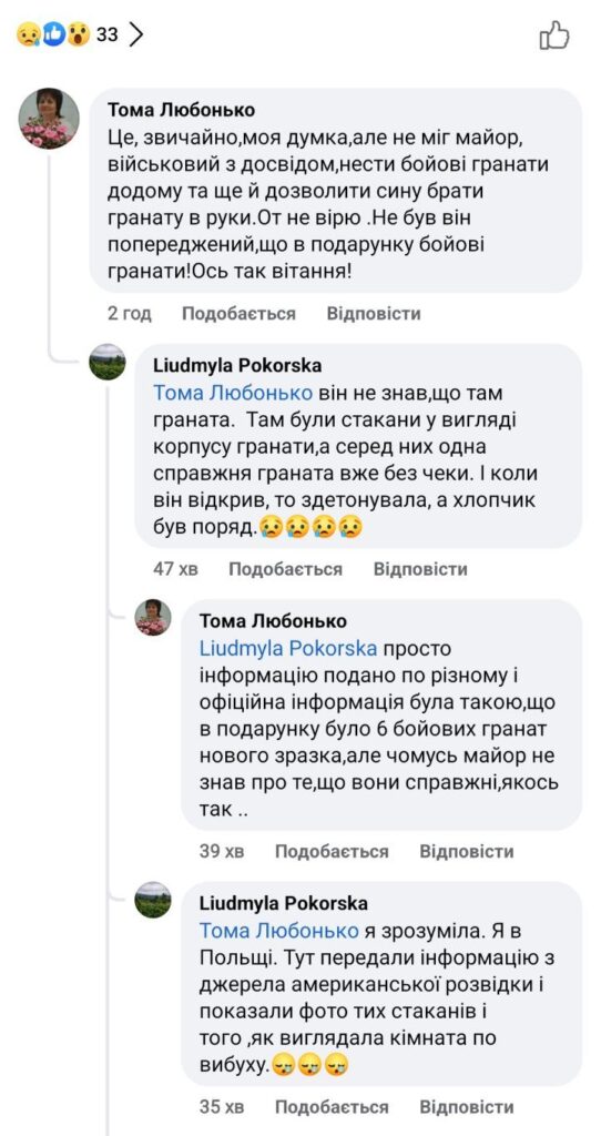 Дістав подарунковий ящик із гранатами всередині та почав демонструвати один із боєприпасів синові. Це були гранати нового західного зразка. Спершу до рук боєприпас взяв син та почав крутити кільце. Далі військовослужбовець забрав гранату в дитини та висмикнув кільце, спровокувавши трагічний вибух. У квартирі поліція знайшла ще пʼять таких нерозірваних гранат. Їх відправлять на експертизу, – зазначає він.