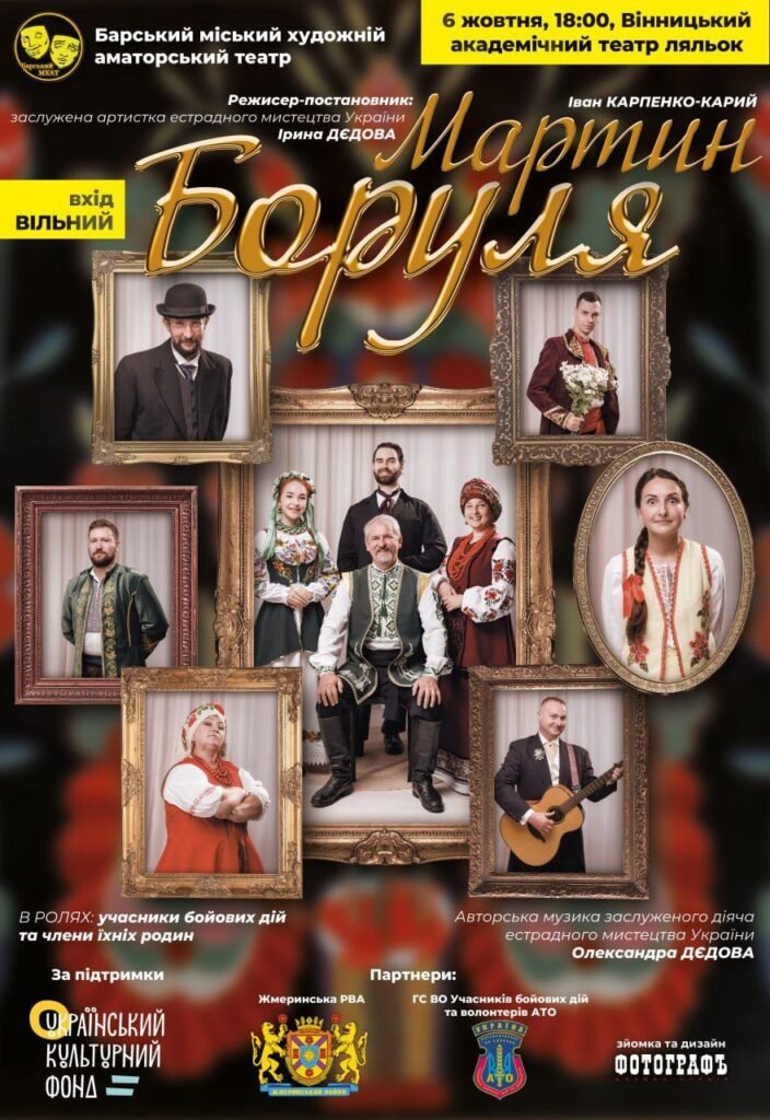 Чи бачили Ви колись виставу, у якій усі актори – ветерани російсько-української війни та члени їхніх родин? Тоді пропонуємо Вашій увазі переглянути постановку класика української драматургії Івана Карпенка-Карого «Мартин Боруля» від акторів Барського міського художнього аматорського театру (МХАТ).