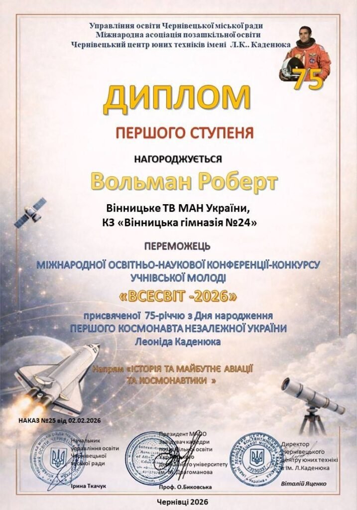 Четвертокласник Вінницької гімназії № 24 Роберт Вольман отримав диплом І ступеня і став переможцем Міжнародної освітньо-наукової конференції-конкурсу учнівської молоді «Всесвіт-2026». Його робота була представлена у напрямку «Історія та майбутнє авіації та космонавтики». А сам конкурс присвячений 75-річчю від Дня народження першого космонавта незалежної України Леоніда Каденюка.